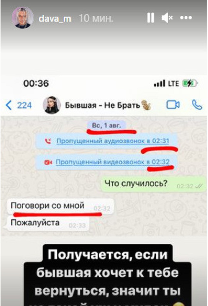 Как оказалось, Ольга хоть и говорит о своем бывшем плохо, но когда ей самой становится в жизни не просто, она звонит и пишет Даве. Последний такой «срыв» был у певицы в августе. По скрину Манукяна видно, что «бывшая – не брать» так записана у блогера в телефоне Бузова, она время от времени пытается связаться с ним по видеосвязи и просит его поговорить с ней.