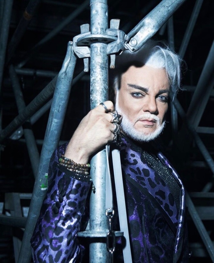 Сначала у Киркорова были искусственные мелкие кудри, а затем певец блондин с голубыми линзами покрасил волосы и бороду в белоснежный цвет.