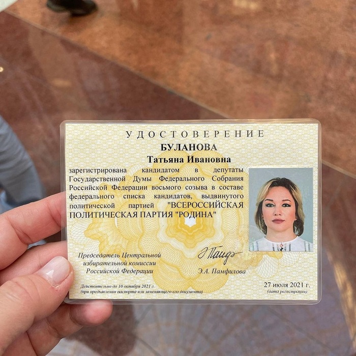 На выборах в Госдуму Буланова будет представлять политическую партию «Родина». 52-летняя исполнительница хита «Ясный мой свет» неделю назад поделилась с подписчиками новостью, что получила удостоверение кандидата в депутаты.