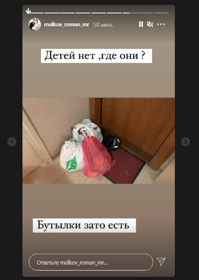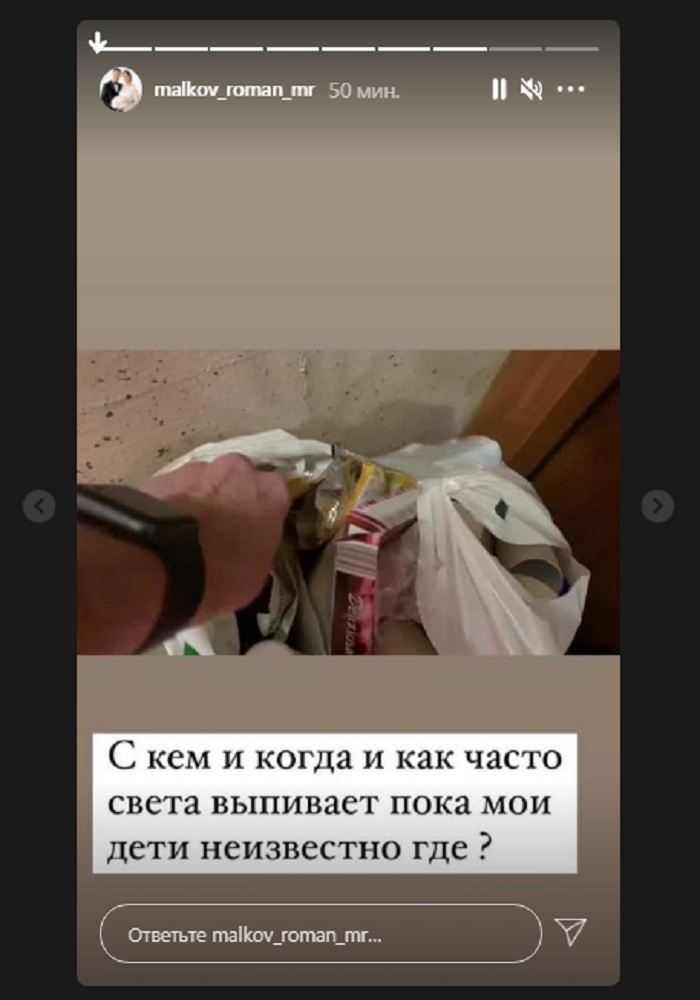 За то, он увидел рядом с дверью, где проживают его дети несколько пакетов с мусором. Он не побрезговал и даже полазил в этих пакетах. К его удивлению, в них он обнаружил пустые бутылки из-под алкогольных напитков. Роман обратился к подписчикам со множеством вопросов: «С кем и когда и как часто Света выпивает, пока мои дети неизвестно где?».