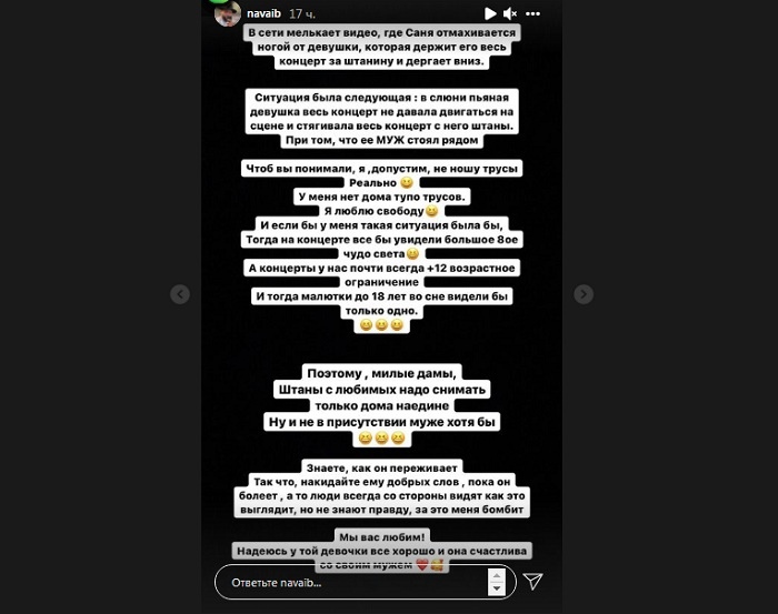 У себя в инстаграм Navai опубликовал пост, в котором встал на защиту своего коллеги. Артист отметил, что решил высказать свою точку зрения после того, как увидел, что эта нарезка с концерта разошлась по сети и люди видят только одно, как Хамали оттолкнул девушку, не зная при этом всей правды.